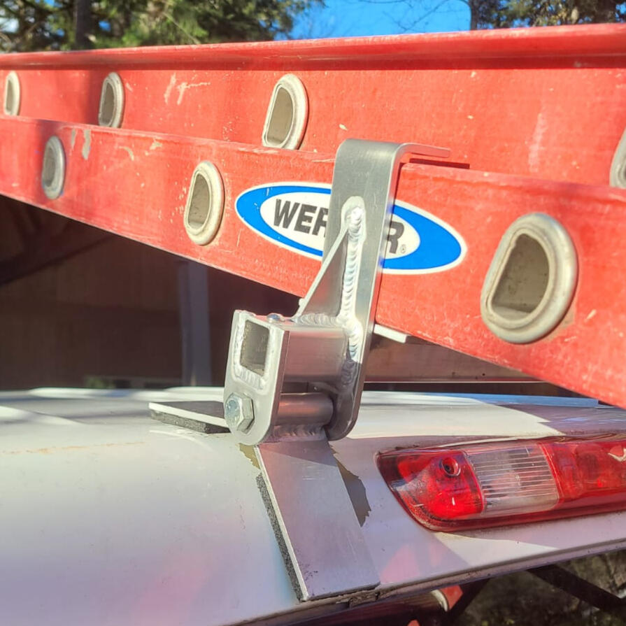 LadderRak is a patented no-drill, portable aluminum tool used for securely transporting ladders on trucks.
